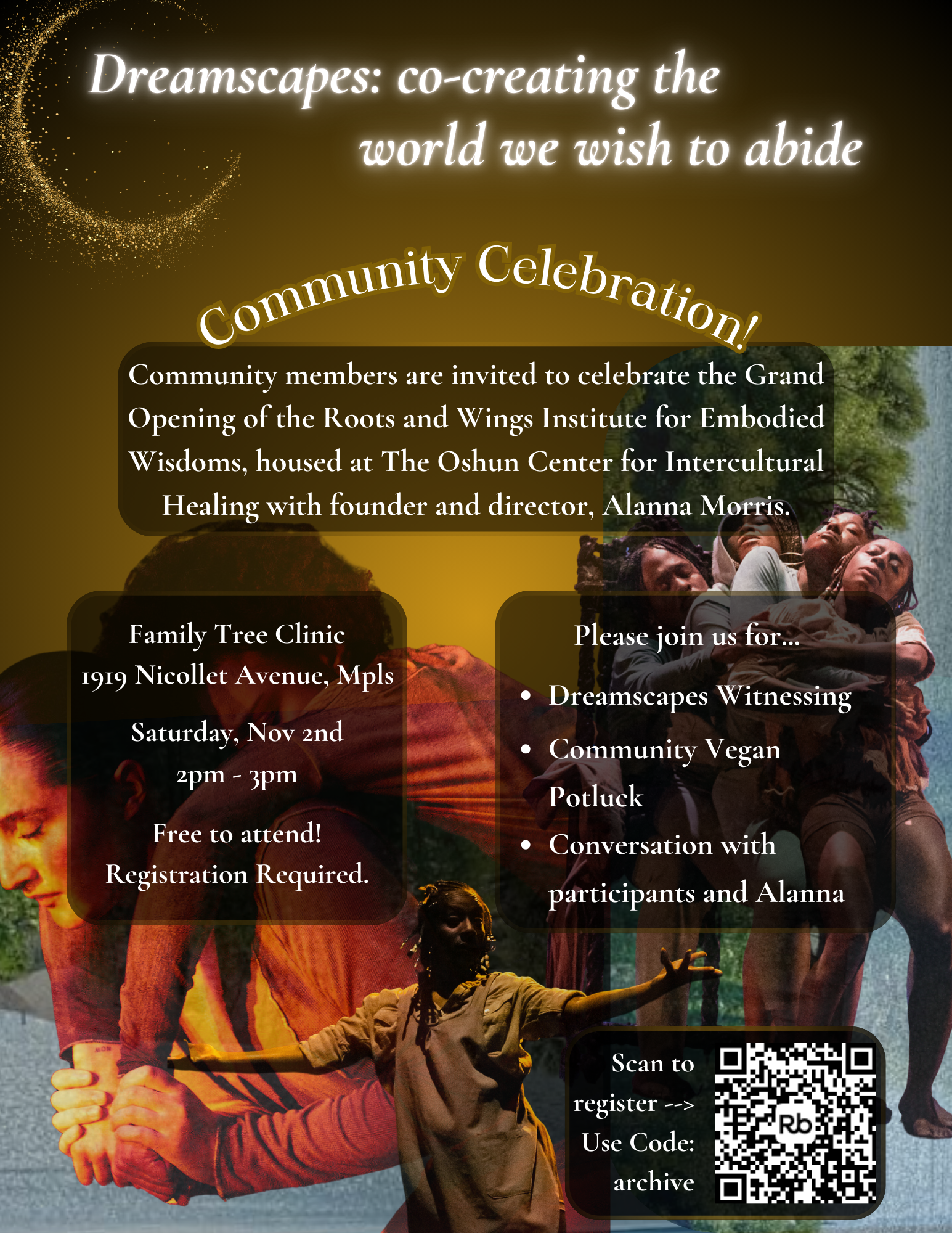 The public is invited to celebrate the Grand Opening of the Roots and Wings Institute for Embodied Wisdoms, housed at The Oshun Center for Intercultural Healing, located within the Family Tree Clinic in Minneapolis, with founder and director, Alanna Morris.